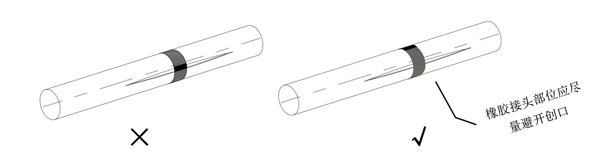 2、清理管道,保障安裝位置平整清潔,將串聯(lián)器內(nèi)外表面涂潤滑劑(食用油、洗潔精等均可)將串聯(lián)器包裹在步驟1畫出的位置上。注意事項(xiàng):如下圖所示,串聯(lián)器的橡膠結(jié)合面應(yīng)朝上,同時(shí)也應(yīng)避開管道破損位置。