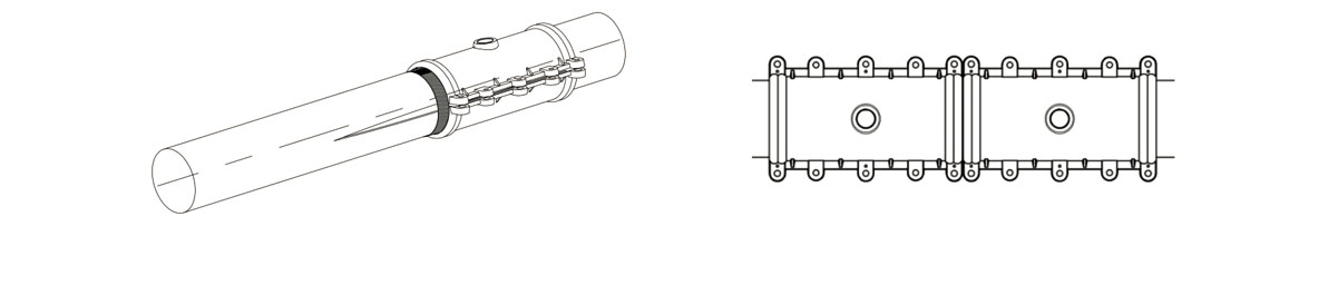 3、用鐵絲、包裝帶等物將串聯(lián)器捆扎牢固,使其緊貼于管道,分別將修補(bǔ)器卡接在串聯(lián)器上,修補(bǔ)器之間應(yīng)盡量少留縫隙。